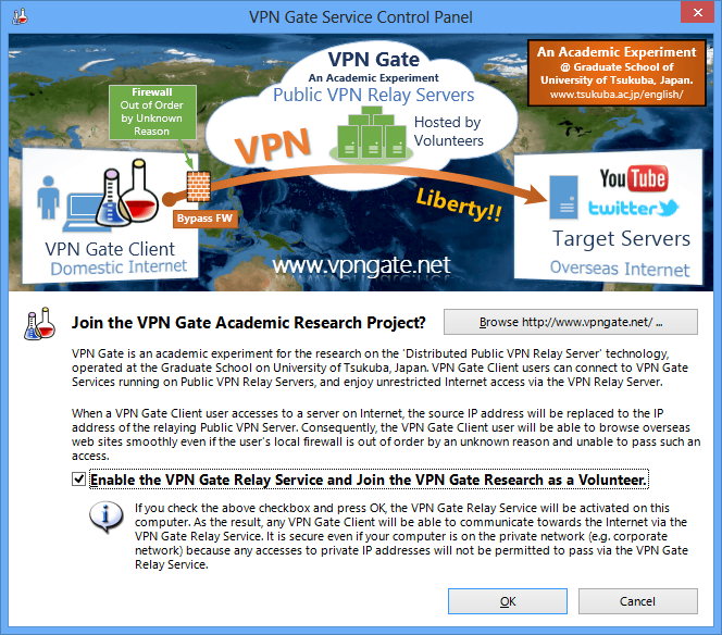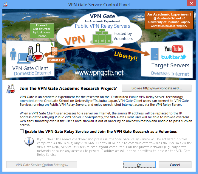 The "VPN Gate Service Control Panel" will appear. Uncheck the "Enable the VPN Gate Relay Service and join the VPN Gate Research as a Volunteer." and click the "OK" button.