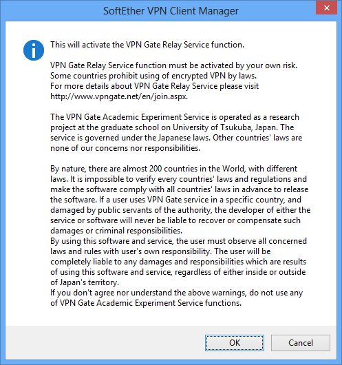 You must understand the risks and the behaviors of VPN Gate Public VPN Relay Server before activate it. There are total four warning screens before you activate the function: a warning on the "Important Notices" screen on the installer and other three warnings before you activate the function, for your safety.